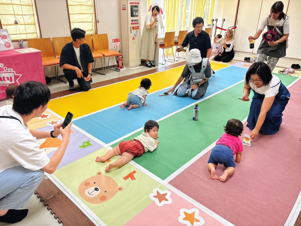 お隣のお友達が気になるお子さま、スタートで休んでいると思ったら一気にハイハイでゴールに行くおこさま、ゴール手前でスタート地点にハイハイするおこさまなど、当日何があるかわからないハイハイレースは毎回楽しいレースです♪