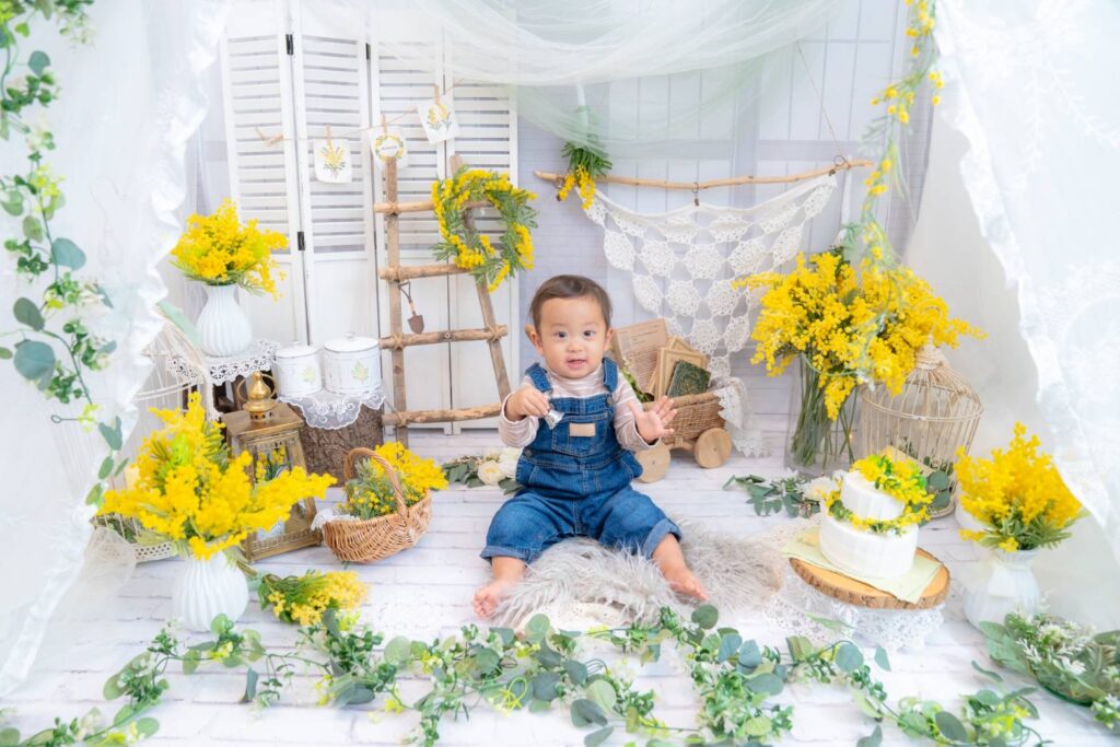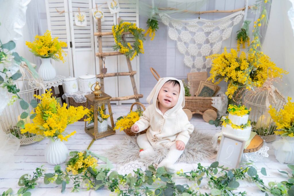 今回のテーマは“春”。ミモザの黄色が華やかに広がるナチュラルなフォトブースをご用意し、やわらかな光に包まれた空間で撮影を行いました。繊細なレースやグリーンに囲まれた空間は、まるで物語の中のワンシーンのよう。お子さまたちの可愛らしい表情がより一層引き立つ、特別な空間となりました。