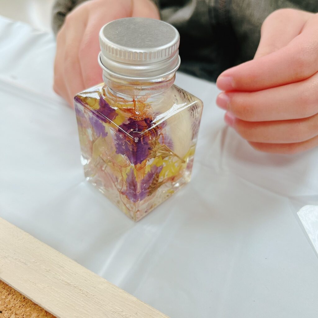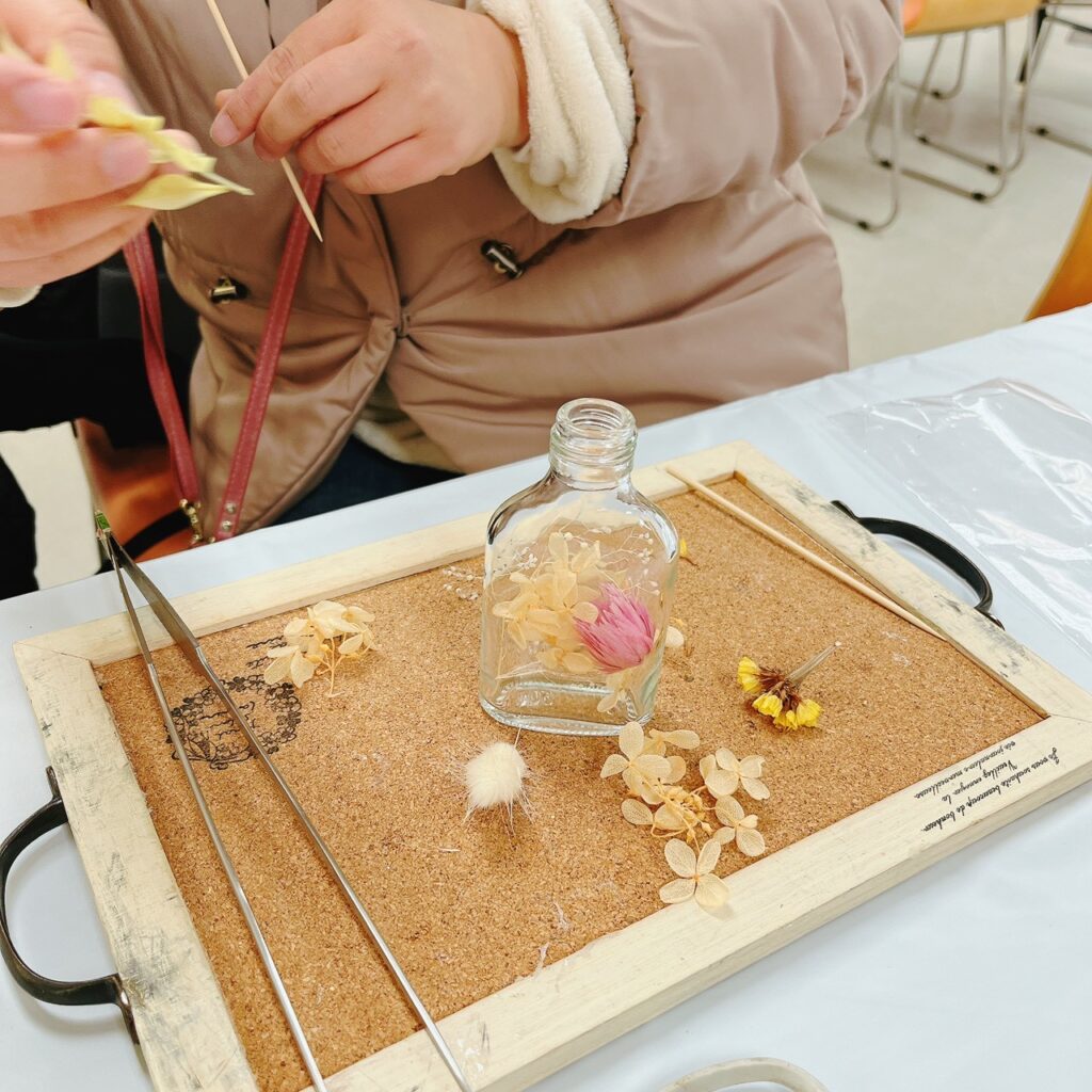 ハーバリウムは、透明なボトルの中にドライフラワーやレモンスライスを丁寧に配置し、専用オイルを注いで完成させます。光に透けるお花やグリーンが美しく、やさしい雰囲気のインテリアとして長く楽しめる作品となりました。